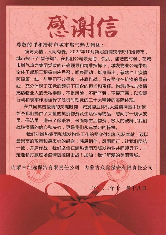11月25日,內(nèi)蒙古坤遠(yuǎn)保潔有限公司和內(nèi)蒙古眾鑫保安有限責(zé)任公司將兩面錦旗和一封感謝信送到了城市燃熱集團(tuán),對(duì)城市燃熱集團(tuán)同舟共濟(jì)、共克時(shí)艱的社會(huì)責(zé)任和擔(dān)當(dāng)精神表示衷心的感謝和崇高的敬意。